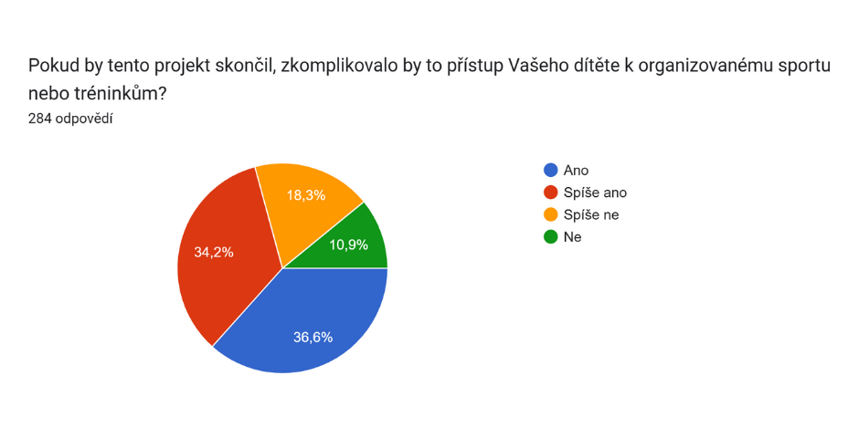 A v souvislosti s tímto ohrožením financování projektu jsme se jich zeptali, zda by konec projektu zkomplikoval cestu jejich dětí k organizovanému sportu. Přičemž pro více než 70 % rodičů by to představovalo či spíše představovalo komplikaci.