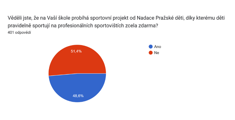 Velmi nás potěšilo, že se za poslední dva roky významně zvýšil počet rodičů, kteří náš projekt znají. Potvrzuje to naše úsilí z posledních let zvýšit povědomí o projektu. Více než 90 %  rodičů, kteří projekt znají a vědí, že se jej jejich dětí účastní a zároveň ví, že je tento projekt organizován a financován Nadací Pražské děti.