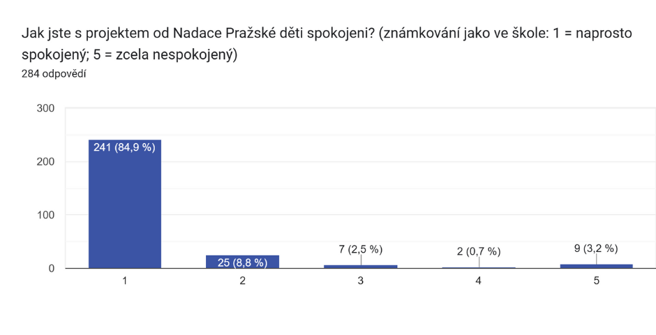 Celkem 97,9 % dotázaných rodičů v našem dotazníku také uvedlo, že oceňuje skutečnost, že je projekt pro jejich děti zcela zdarma a veškeré náklady hradí Nadace Pražské děti. Toto číslo je navíc téměř identické (97,5 %) i u rodičů, kteří náš projekt doposud neznali.